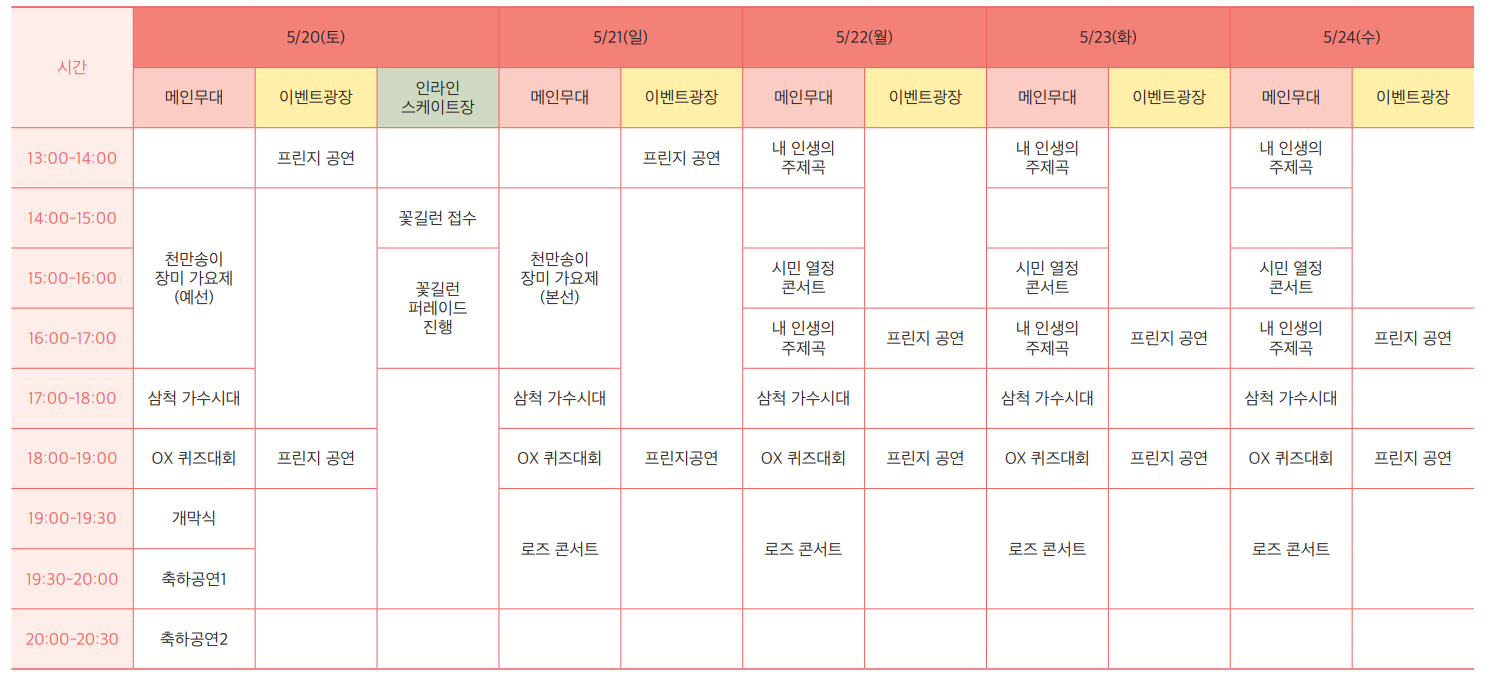 24일까지 지역 학생과 시민, 동아리 등이 참여하는 ‘삼척시민 열정 콘서트’도 열린다고 하구요, 지역 예술인 공연인 ‘삼척 가수시대’, 시민과 함께하는 ‘꽃길 달리기 행렬’, 신청곡을 사연과 함께 들려주는 ‘내 인생의 주제곡’, 버스킹 공연 등 다양한 공연이 준비되어 있어 볼거리가 가득한 축제라고 볼 수 있어요.