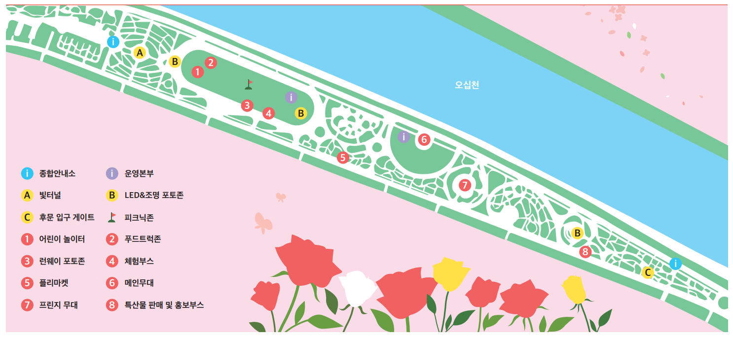 무엇보다 21일부터 24일까지 가수와 뮤지컬배우 등이 출동해 봄과 장미꽃을 주제로 한 ‘로즈 콘서트’를 진행한다고 하니 놓칠 수 없겠죠? 이 밖에 페이스페인팅·캐리커처 등의 체험과 범퍼카·회전그네·미니바이킹·에어바운스 등 어린이 놀이터, 지역 특산물 판매장, 푸드트럭 등도 운영될 예정이니 참고하시기 바랍니다.