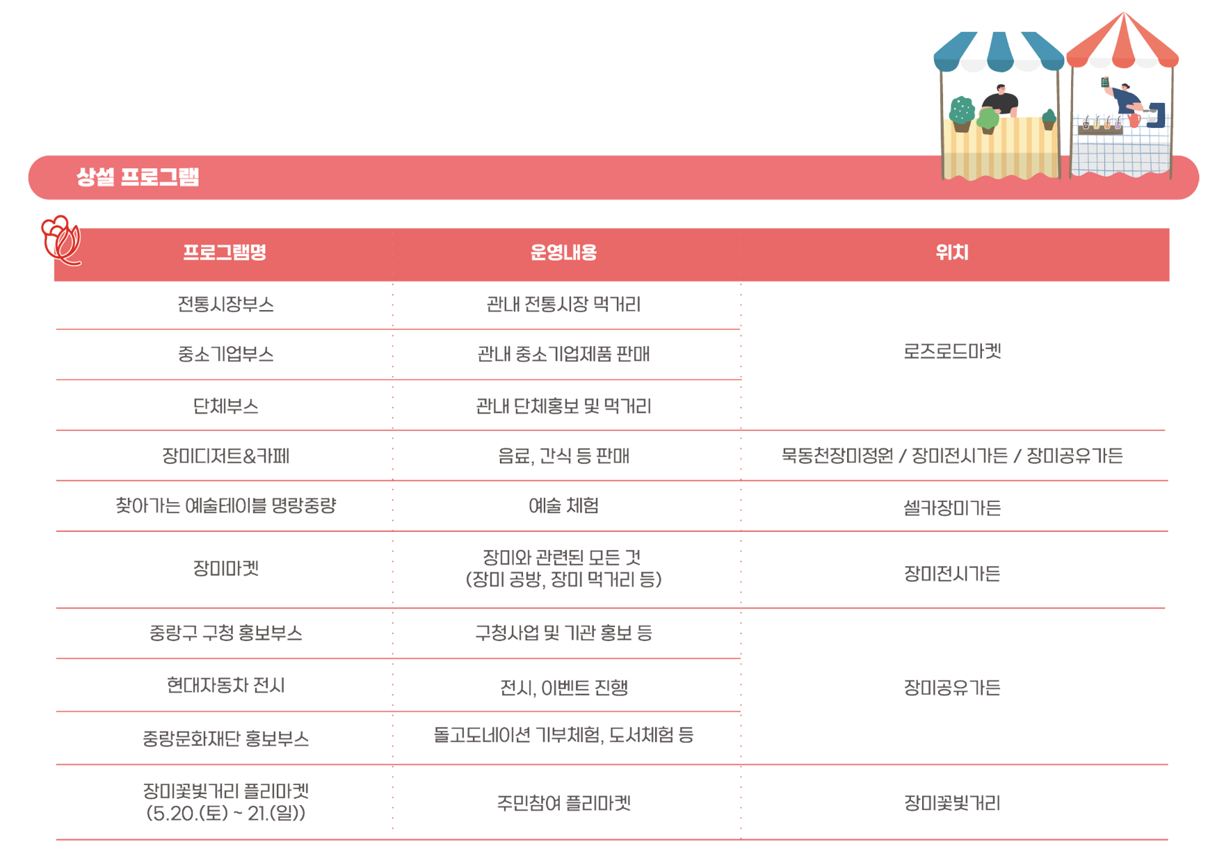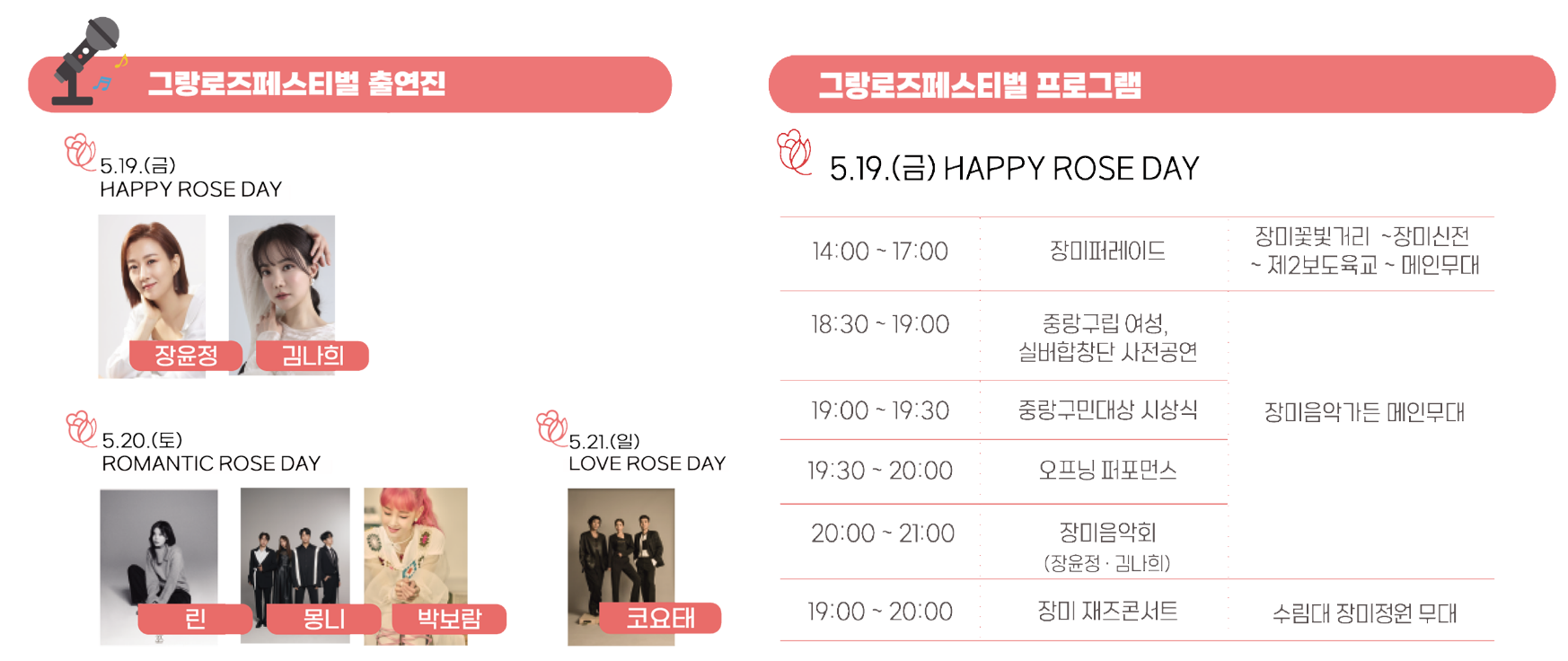 - 리틀로즈페스티벌(중랑장미공원 전역) : 5.13.(토) ~ 5.18.(목), 5.22.(월) ~ 5.26.(금)