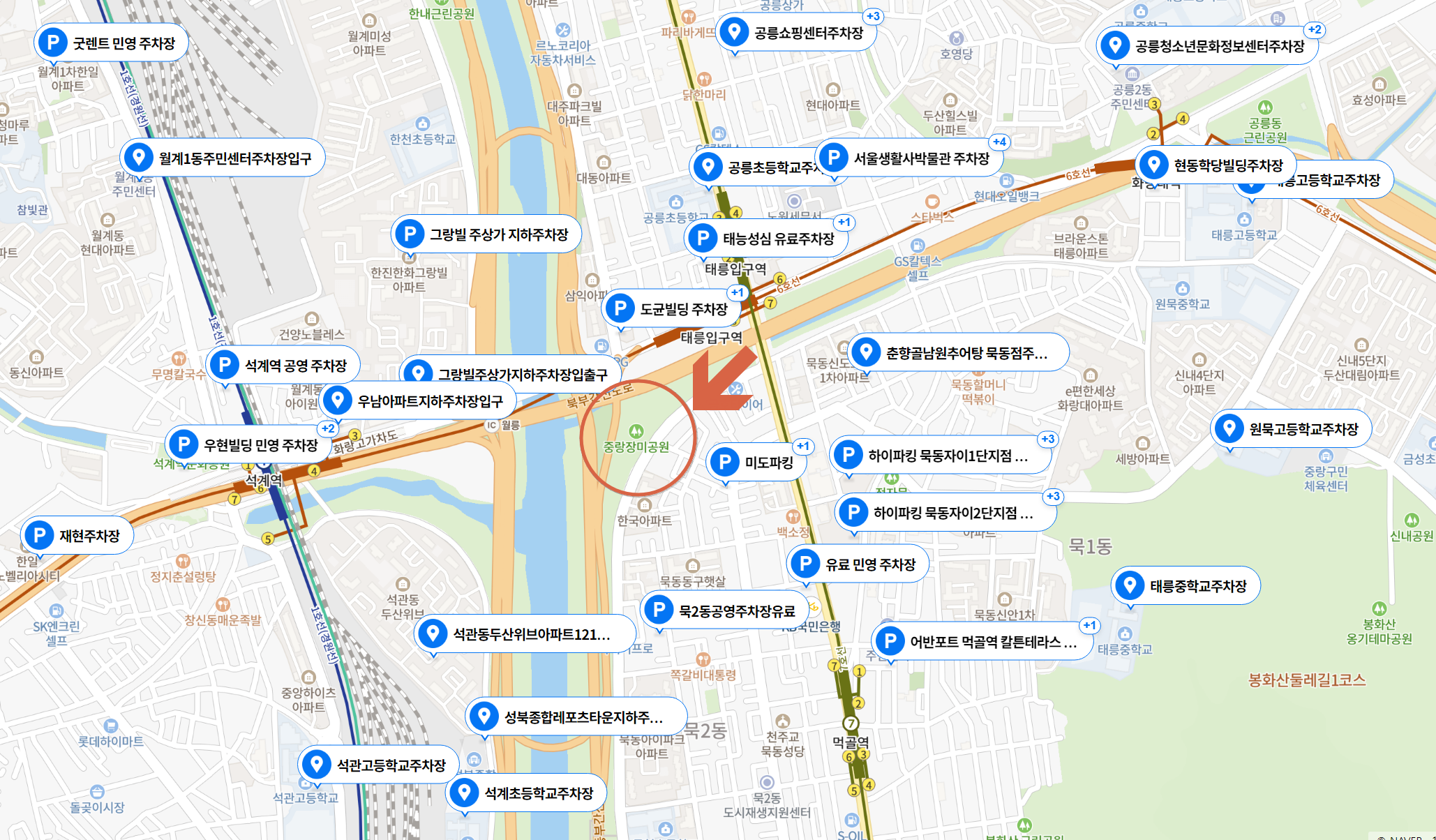 서울 장미축제가 열리는 중랑 장미공원 주위에서 가장 가까운 주차장은 도보 5분 거리에 북부지원 주변 노상공영주차장(공릉동 629-1)과 서울생활사박물관 주차장이라고 볼 수 있습니다.