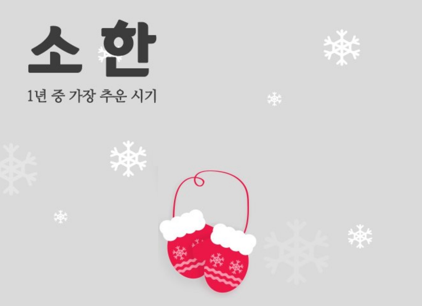 소한은 24절기 중 23번째 절기로 보통 양력 1월 5일~1월 6일 무렵에 들게 됩니다. 소한(小寒) 뜻은 작을 소, 찰 한으로 작은추위를 의미하는데요, 실제로 우리나라에서는 가장 날씨가 추울 때입니다. 태양이 황경(黃經) 285도의 위치에 있을 때이기도 하며 소한 무렵은 정초한파(正初寒波)라 불리는 강추위가 몰려오는 시기로 알려져 있어요. 삼한사온이라는 말처럼 삼일 춥고 사일 따스한 기후가 본격 시작되는 것도 소한 무렵이구요, 24절기 중에서는 해가 가장 늦게 뜨는 날이기도 해요.