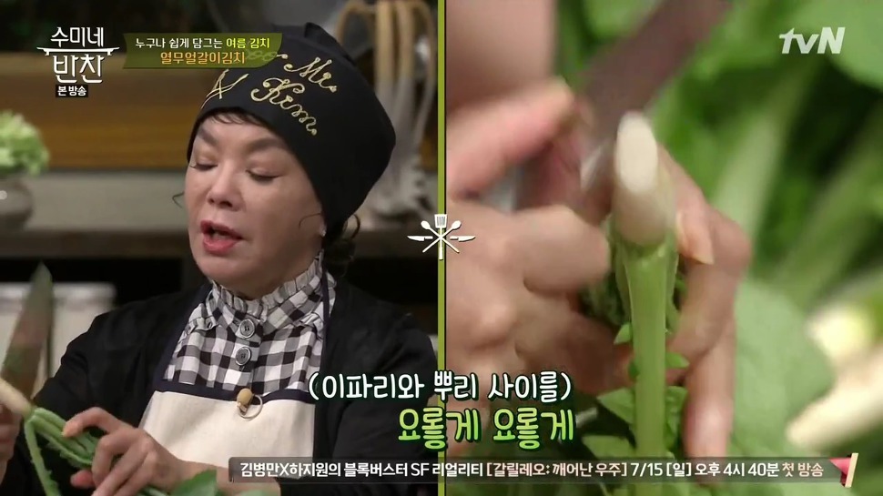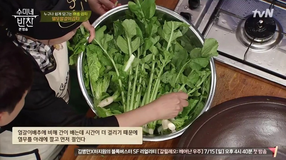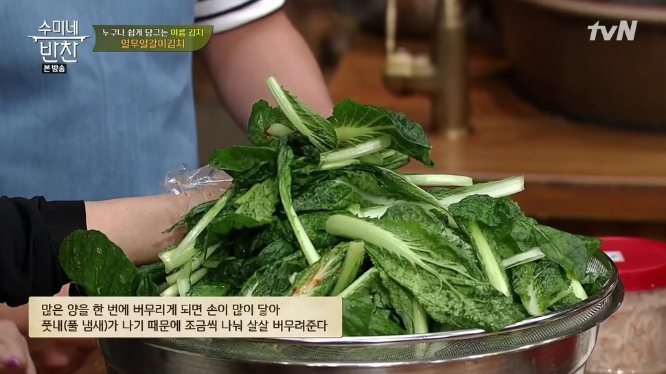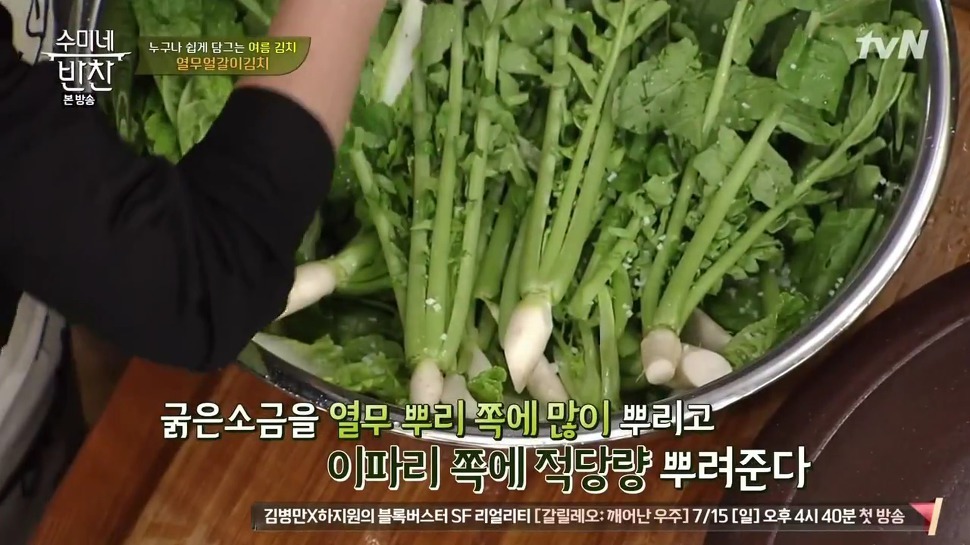 또한 열무 이파리보다는 뿌리 부분이 절이는 시간이 더 오래 걸린다고 해요. 따라서 뿌리를 먼저 뿌리고 줄기 이파리 순으로 뿌려 주세요.