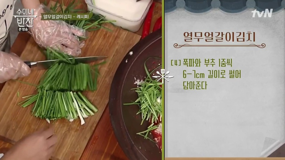 7. 쪽파 한줌과 부추 한줌을 6~7cm 길이 정도로 자르고 볼에 담습니다.