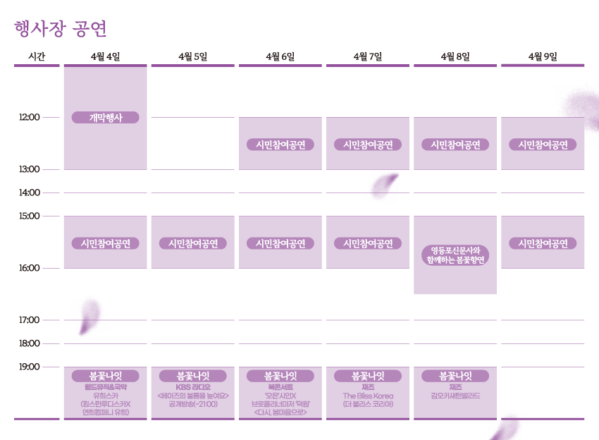 매일 오전 11시 30분부터 저녁 6시까지 벚꽃길 위에서 치열한 경쟁을 뚫고 선정된 실력 있는 팀들의 버스킹을 만날 수 있습니다. 또한 국회둔치축구장인 메인 무대에서는 매일 저녁 7시 월드 뮤직, 북 콘서트, 재즈 등 다양한 공연이 펼쳐질 예정이며 4월 5일 오후 7시에는 KBS 라디오 ‘헤이즈의 볼륨을 높여요’ 공개 방송이, 4월 6일 오후 2시 30분에는 서울경찰청 기마대가 시민들을 찾아 풍성한 볼거리를 제공할 예정이라고 하니 모쪼록 즐거운 축제 즐기고 오시길 바랍니다.