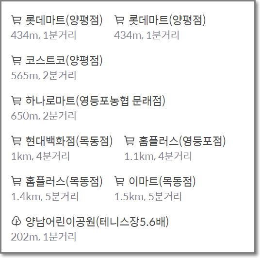 롯데마트(양평점)와 코스트코(양평점) 등의 대형마트가 도보권에 위치했으며, 이마트, 홈플러스 등도 가까이 있고, 반경 2km 내에는 현대백화점, 롯데백화점, 신세계백화점 이대목동병원, 목동종합운동장 등이 위치하고 있습니다. 또한 안양천 변을 따라 마련된 체육시설 이용도 쉬운 편입니다.