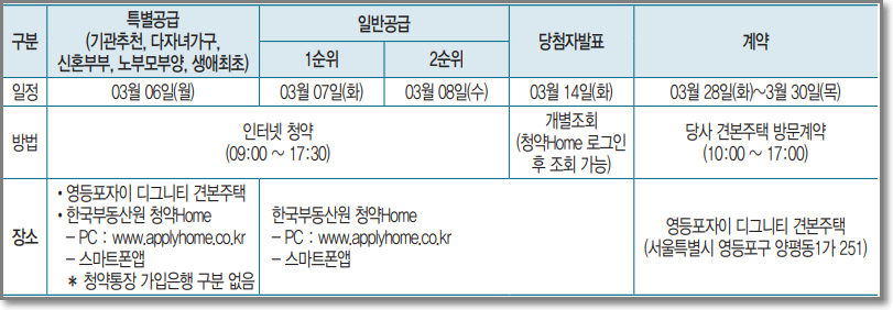 영등포 자이 디그니티 청약일정은 3월 6일(월) 특별공급을 시작으로, 7일(화) 1순위, 8일(수) 2순위 청약 접수를 받습니다. 당첨자 발표는 3월 14일(화)이며, 당첨자 정당계약은 3월 28일(화)~30일(목) 3일간 진행될 예정입니다.