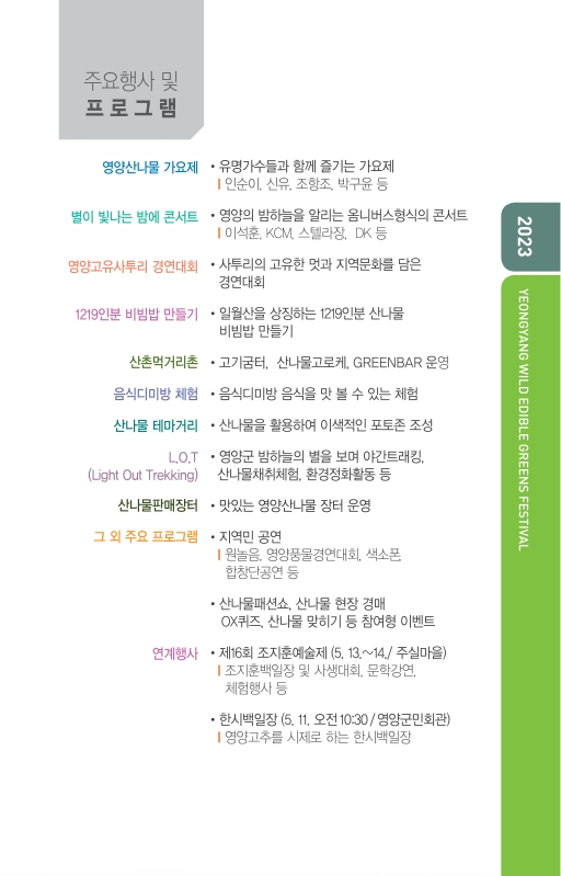 2. 부대프로그램 : 산나물비빔밥만들기, 영양 산나물 가요제, 영양 별이 빛나는 밤에 콘서트, 산나물 사투리 경연대회