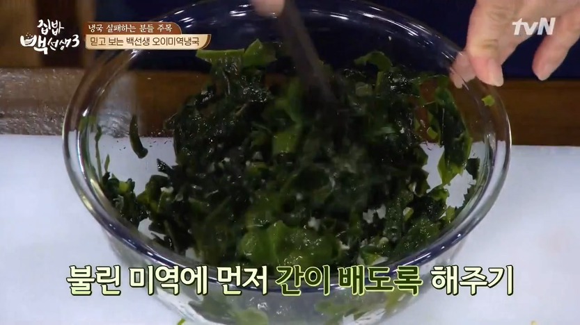 나중에 채소에서 즙이 나오면서 미역에 간이 배지 않을 수 있다고 하는데요, 먼저 밑간을 하고 물을 붓는 것이 오이냉국 황금레시피의 포인트!