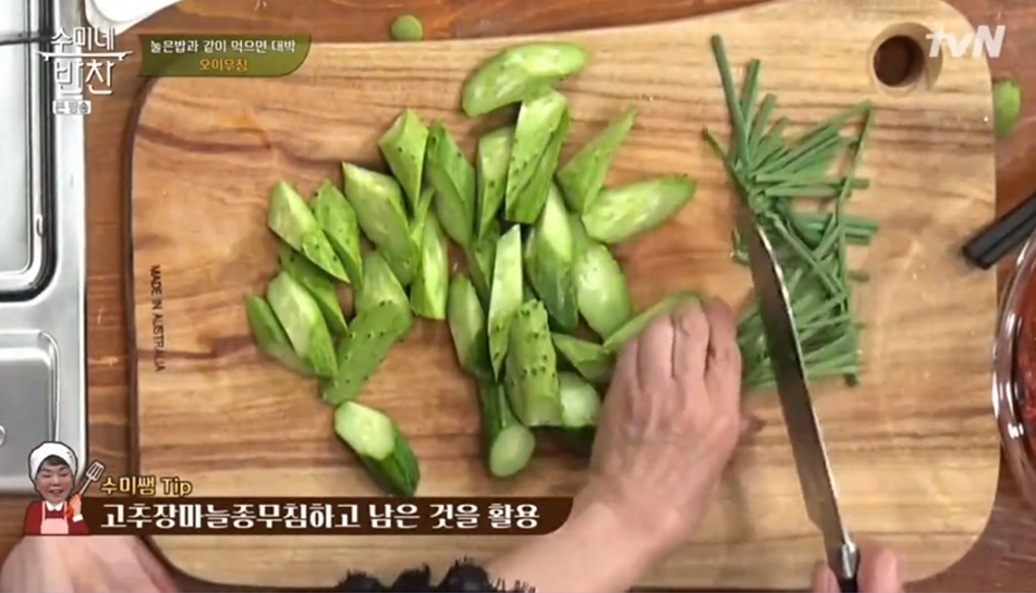 오이무침 황금레시피 김수미 오이무침의 또 다른 특징은 양념장에 간장을 넣지 않는다는 거예요.