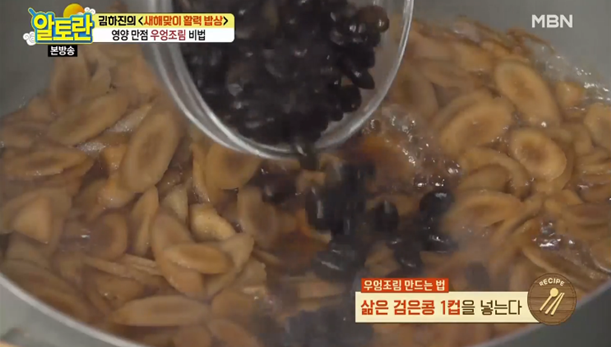 16. 20분 후에 삶은 검은콩 1컵을 넣고 바짝 조립니다.