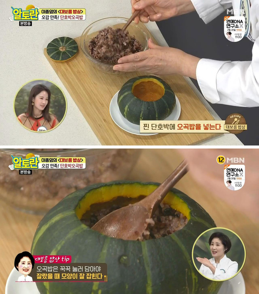 여기서 정월대보름 오곡밥 만드는 방법 재료 이종임 오곡밥 맛있게 찌는법의 비법, 바로 단호박과 오곡밥을 따로 찌는 것인데요, 단호박 속에 오곡을 넣고 익히면 시간이 너무 오래 걸리기 때문이라고 해요. 하루종일 익혀야 한다고 하네요. 따라서 오곡밥을 먼저 만든 후 단호박에 넣어주시는 것이 좋습니다.