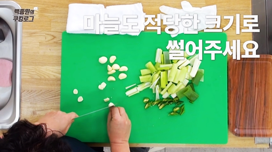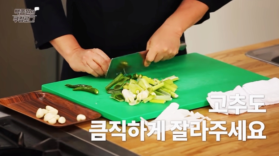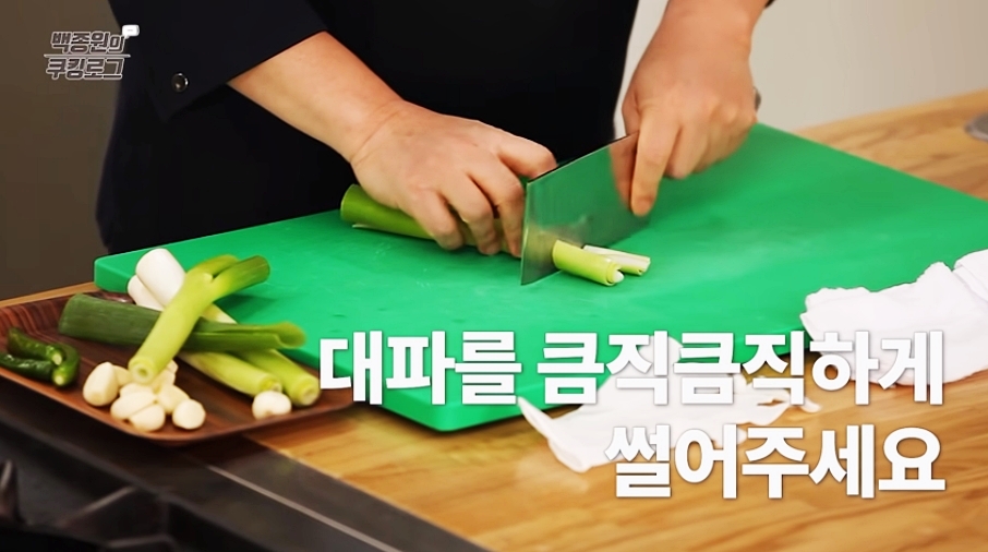 1. 대파를 반 갈라 5cm 길이로 썰고, 청양고추는 두껍게 어슷하게 썰어 채소를 준비해 주세요.