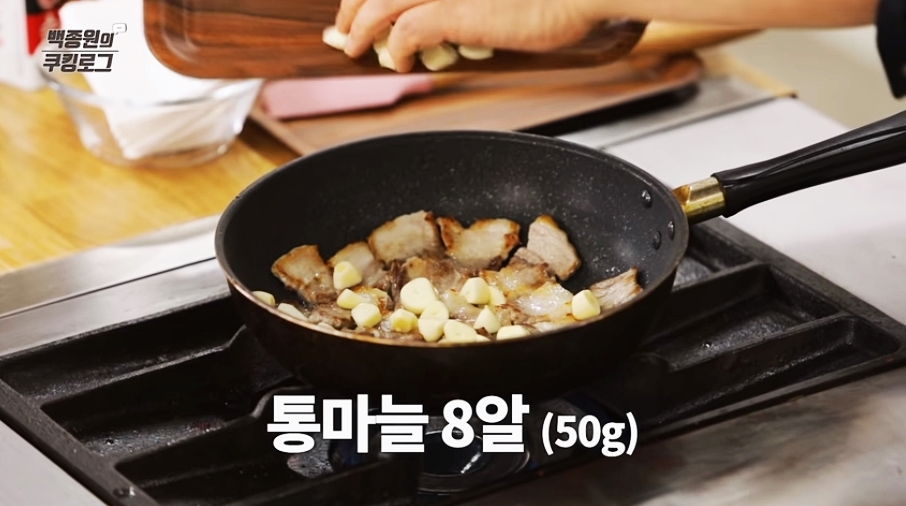 4. 삼겹살이 노릇하게 익으면 마늘을 넣어 함께 구워줍니다.