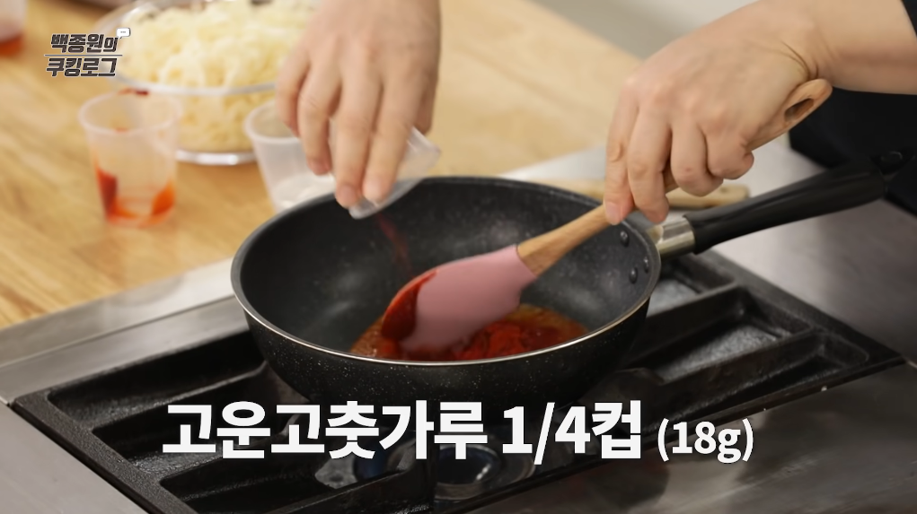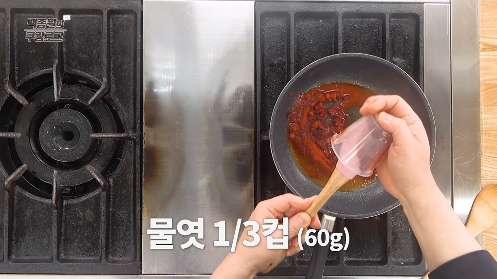 3. 이제 양념장을 만들 차례인데요, 프라이팬에 고추장, 고운고춧가루, 물엿, 황설탕, 물을 넣고 잘 저어가며 설탕이 녹을정도 까지 끓이면 됩니다.
