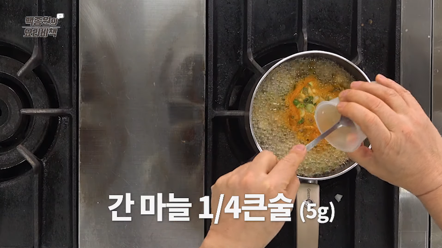 9. 찌개가 끓어 오르면 간마늘, 청국장을 넣고 잘 풀어가며 끓입니다. 이 때 기호에 따라 청국장 양을 조절합니다.