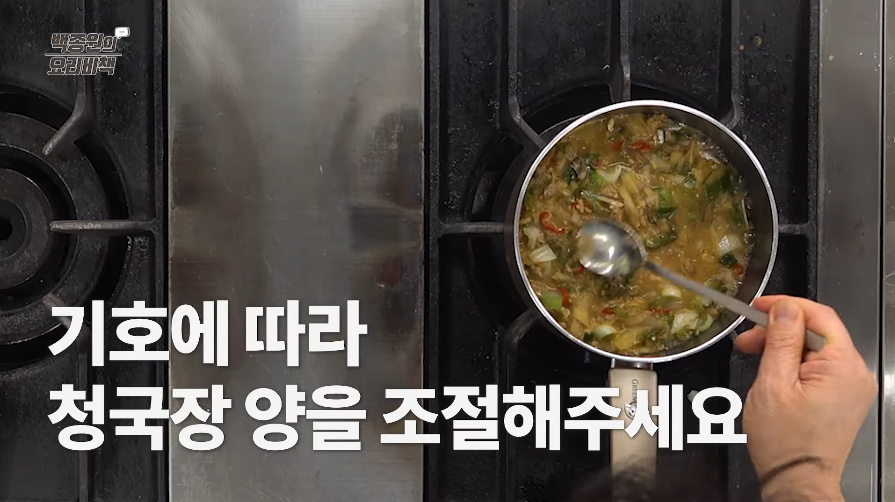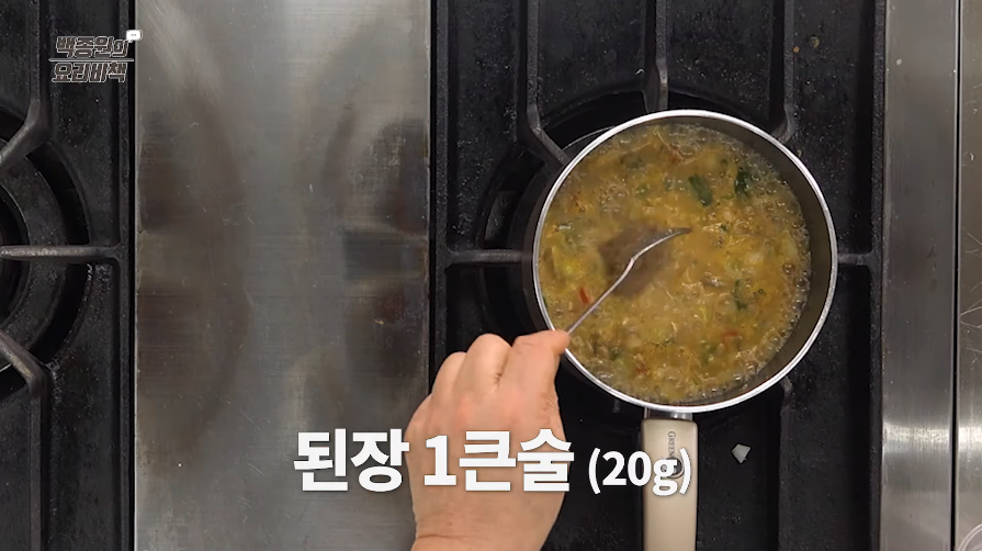 10. 청국장이 다 풀어지면 된장을 넣어 간을 맞춥니다. 된장 대신 청국장을 추가로 넣어 간을 맞춰도 좋습니다.