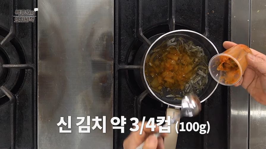 5. 청국장 맛있게 끓이는 방법 비법재료인 신김치는 가위를 이용하여 잘게 잘라 준비합니다.