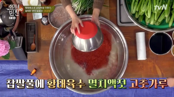 양념 : 찹쌀풀 1L, 황태육수 3L, 멸치액젓 400g, 고춧가루 3kg, 다진 마늘 2큰술, 새우젓 3큰술