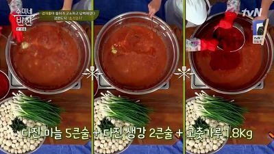 3. 이제 총각김치 양념을 만들 차례인데요, 김수미쌤은 총각김치를 만들기 전에 먼저 갓김치를 만드셨기 때문에 남은 양념을 활용하였어요.