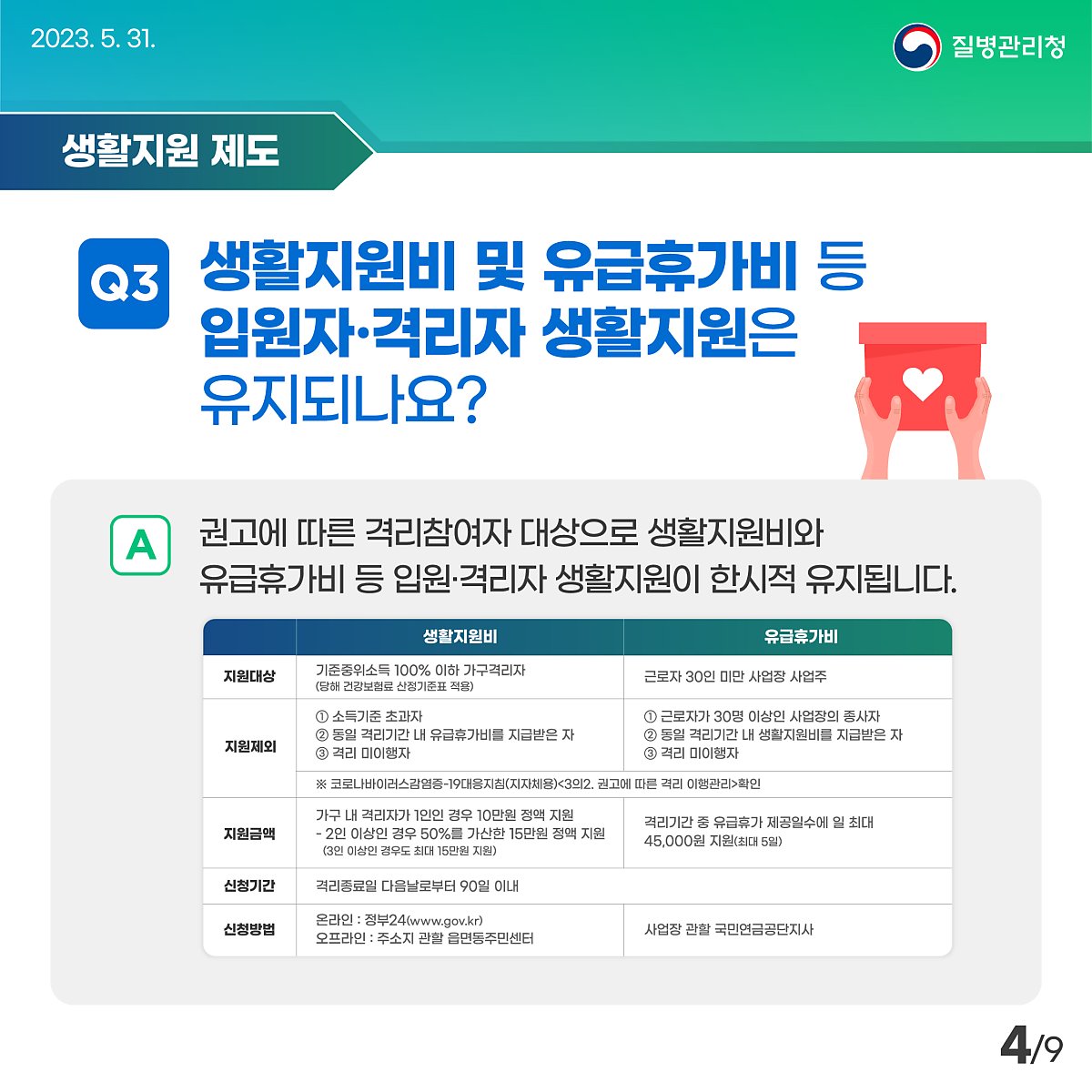 또한 코로나 확진자 격리기간이 5일 권고로 전환되는 이후에도 입원·격리참여자에 대한 생활지원비 및 유급휴가비용 지원은 당분간 지속된다고 하는데요, 지원기준·지원금액은 그대로 유지하되, 관할 보건소에 격리 참여 등록을 한 대상에만 지원하는 것으로 바뀌게 된다고 합니다.