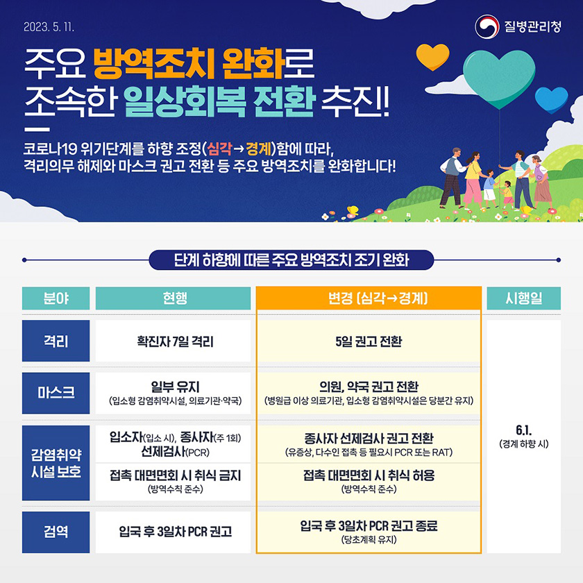 코로나 확진자 격리기간 해제 (6월부터) 소식과 달라지는 방역 지침을 정리해보도록 하겠습니다. 6월 1일부터 코로나 확진자 격리기간 7일 의무가 해제됩니다. 실내마스크 착용 의무도 병원급 이상 의료기관, 입소형 감염취약시설을 제외하고 사라지게 되는데요, 이번 조치는 국내에서 코로나19 첫 감염자가 나온지 3년 4개월만으로 사실상 방역조치 대부분이 해제되는 것이라고 볼 수 있습니다.
