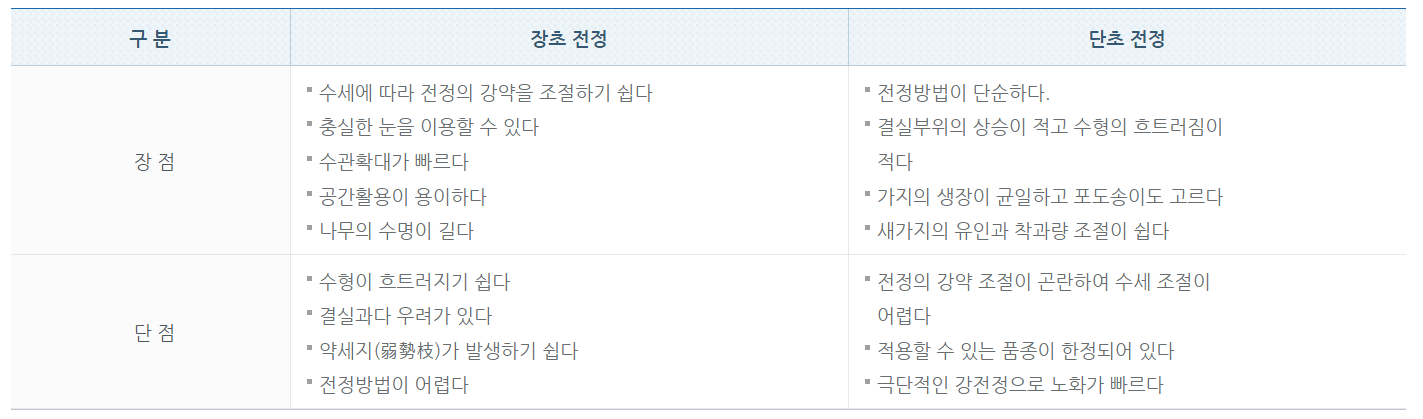 가지치기 방법은 남기는 눈의 수에 따라 단초전정, 중초전정, 장초전정으로 구분할 수 있습니다. 단초전정은 눈을 1~3개 남기고 자르는 방법으로, 수세가 약한 품종이나 노쇠한 나무에 적합합니다. 중초전정은 눈을 4~6개 남기고 자르는 방법으로, 수세가 중간 정도인 품종이나 성과기의 나무에 적합합니다. 장초전정은 눈을 7개 이상 남기고 자르는 방법으로, 수세가 강한 품종이나 유목기의 나무에 적합합니다.