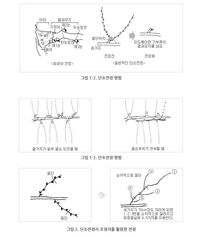 포도나무의 수형은 지주나 철사에 따라 다양하게 만들 수 있습니다. 일반적으로 웨이크만형, 일문자형, 에이치자형, 올백형 등에서 단초전정을, 엑스자형, 우산형, 니핀형 등에서 중·장초전정을 이용합니다. 품종별로는 캠벨얼리, 진옥 등은 단초전정을, 나이아가라, 세르단 등은 중초전정을, 거봉계, 델라웨어 등은 장초전정을 하는 것이 좋습니다.
