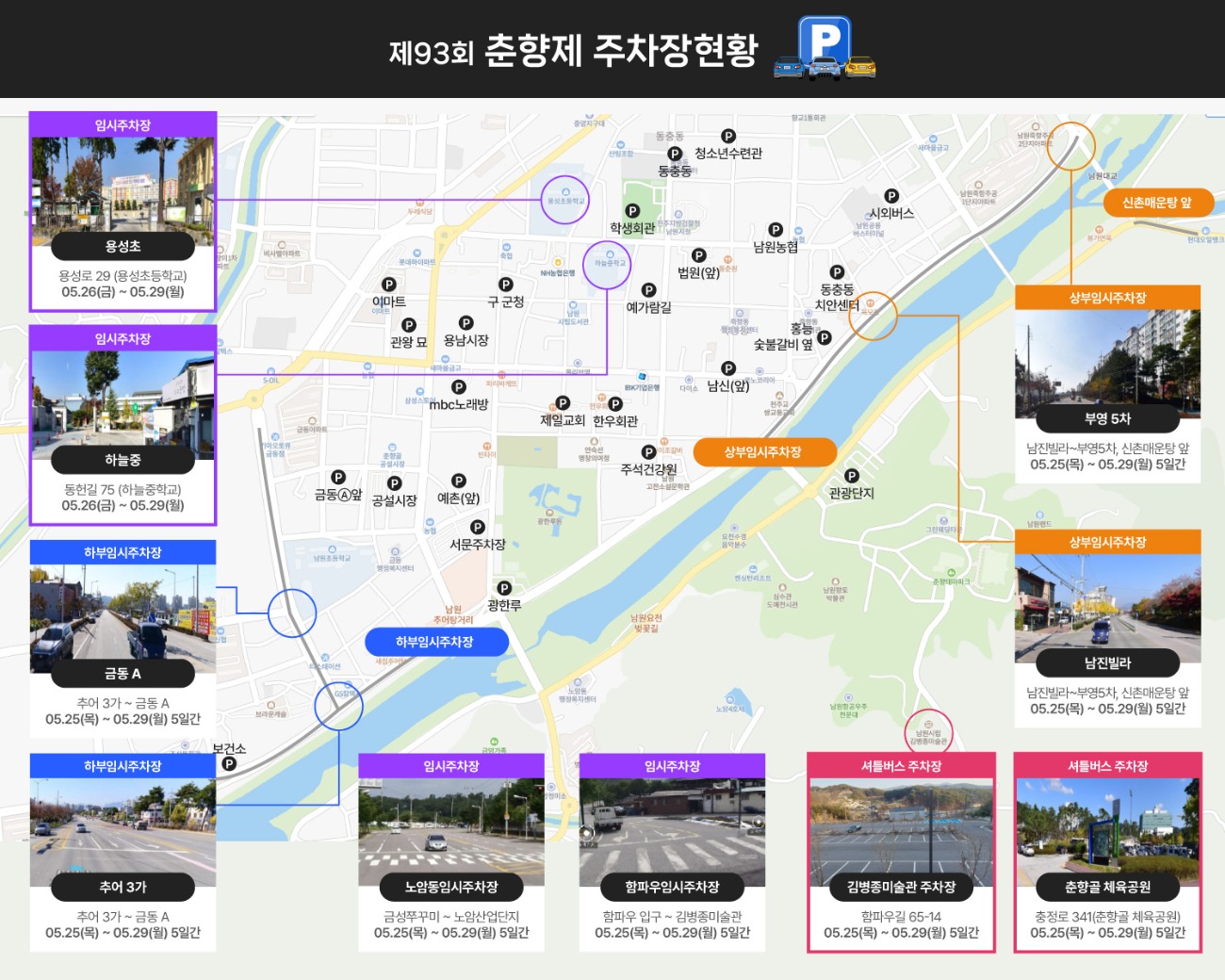 임시로 운영되는 주차장은 용성초 / 하늘중 / 추어 3가 ~ 금동 A / 노암동 / 함파우 / 부영 5차 / 남진빌라 등입니다. 용성초와 하늘중은 26일부터 주차가 가능하다고 하구요,