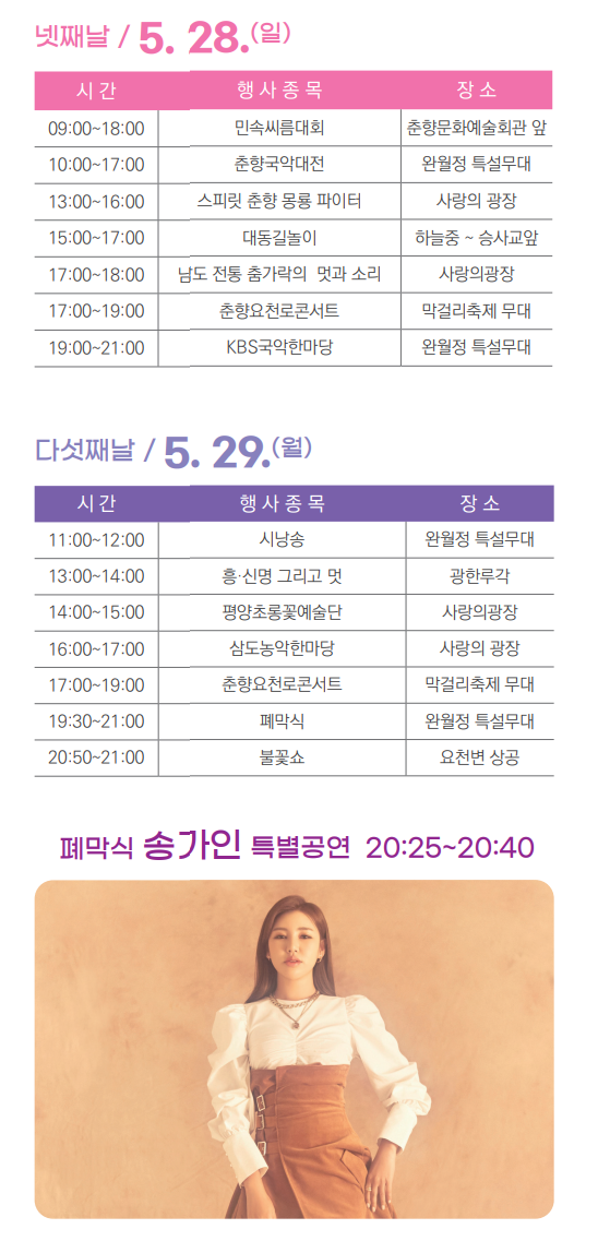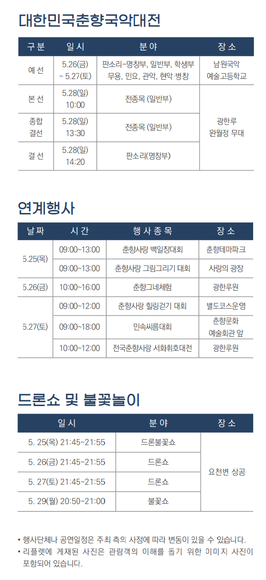 축제의 마지막은 우리나라 최고의 명인·명창 등용문 가운데 하나인 춘향국악대전과 뮤지컬 춘향 등을 통해 대미를 장식할 예정이라고 하는데요, 이 밖에 지역 농특산물과 다양한 먹거리를 선보이는 월매장터 및 야시장, 풍성한 전통놀이와 체험 행사, 벼룩시장도 마련되어 있으니 가족과 함께 주말 나들이 다녀 오셔도 좋을 것 같습니다.