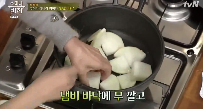 3. 물 2.5L와 손질된 LA 갈비, 무, 대파 한 대, 손질한 통양파를 넣고 센불에 끓입니다. 양파는 껍질을 제거하지 않고 손질하여 넣어 주세요.