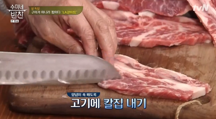 9. LA갈비찜 맛있게 만드는 법 이제 양념에 LA갈비 재우기를 할 차례인데요, 고기에 양념이 잘 배도록 칼집을 내줍니다.