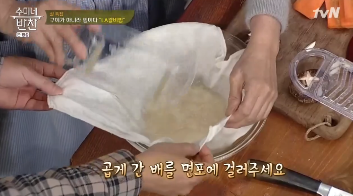 4. 곱게 간 배와 양파를 면포에 걸러줍니다. 고기를 배즙에 재우는 이유가 있는데요, 육질은 부드럽게 해주고 국물에 단맛을 더해주기 때문입니다.