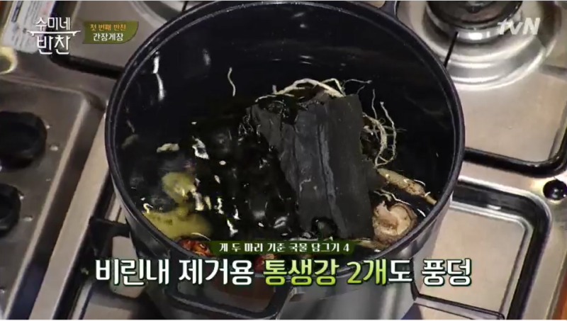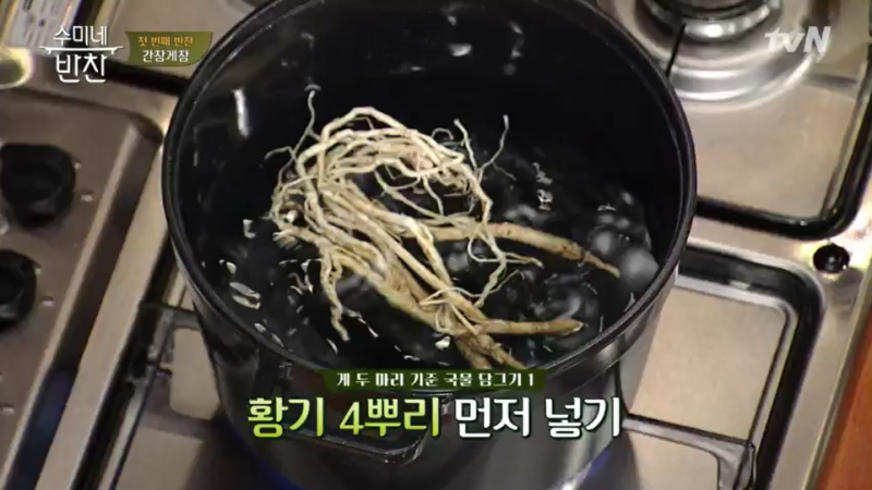 재료 : (게 2마리 기준) 황기 4뿌리, 다시마 4장, 마른 표고버섯 6개, 통생강 2개, 통마늘 9개, 대추5개, 대파뿌리 2개, 양파, 사과 반개, 월계수잎 4개, 마른 홍고추 10개, 육수용 멸치, 밴댕이 8마리, 고추씨 2큰술, 통후추 1작은술, 양조간장, 매실액 2큰술, 사이다 2큰술, 소주1큰술, 면포, 물 2.5L