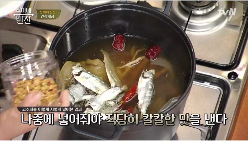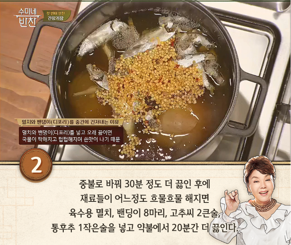 육수용 멸치와 밴댕이8마리, 고추씨 2큰술, 통후추 1작은술을 넣고 약불에서 20분간 더 끓여 줍니다.