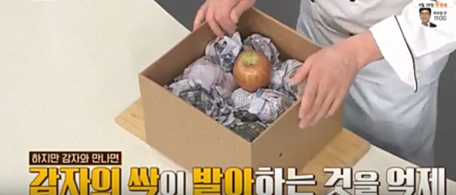 4. 여기서 감자 보관법 꿀팁 한가지! 바로 사과를 함께 넣는 건데요, 감자 사이에 사과를 넣어 같이 보관하면 사과에 있는 식물 호르몬인 에틸렌 가스가 감자의 싹이 발아하는 것을 억제하여 싹이 덜 나게 하기 때문이예요.
