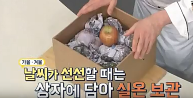 마지막으로 감자와 함께 사과를 올려 선서하고 그늘진 실온에 두시면 감자 보관법이 마무리 된답니다.
