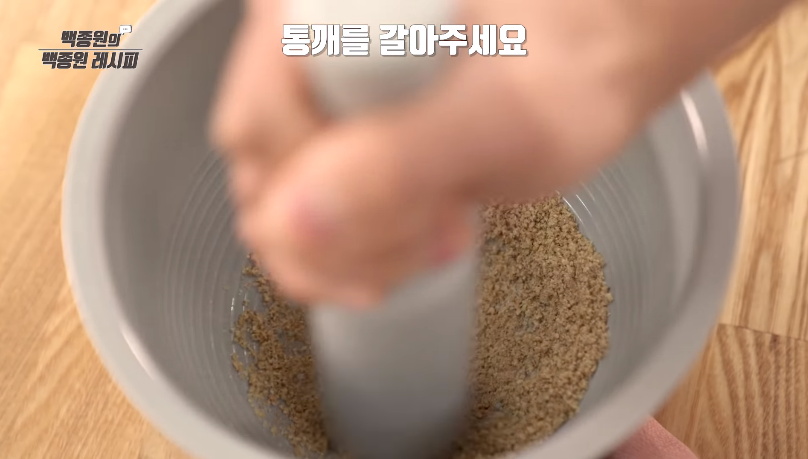 여기서 미리 해두실 것이 있는데 바로 통깨 1큰술을 절구에 넣고 갈아주는 거예요. 깨만 잘 써도 고사리나물이 60점은 될거라고 할 정도로 맛이 확 살아난다고 하네요.
