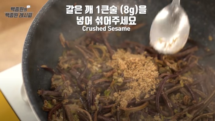 7. 갈아둔 깨를 넣어 섞은 후 완성그릇에 담고 깨소금을 뿌려 마무리하면 고사리나물 맛있게 하는 법 백종원 고사리나물 황금레시피가 완성됩니다.