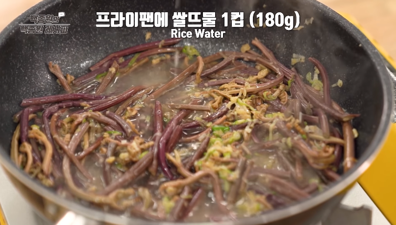 6. 고사리나물 맛있게 하는 법 두 번째 팁! 바로 쌀뜨물을 사용하는 거예요. 쌀을 3번 씻어 물을 버린 후 한번 더 쌀을 씻은 것을 쌀뜨물로 사용하시면 돼요. 만약 쌀뜨물이 없으면 그냥 맹물이나 육수, 멸칫국물을 쓰기도 한다네요.