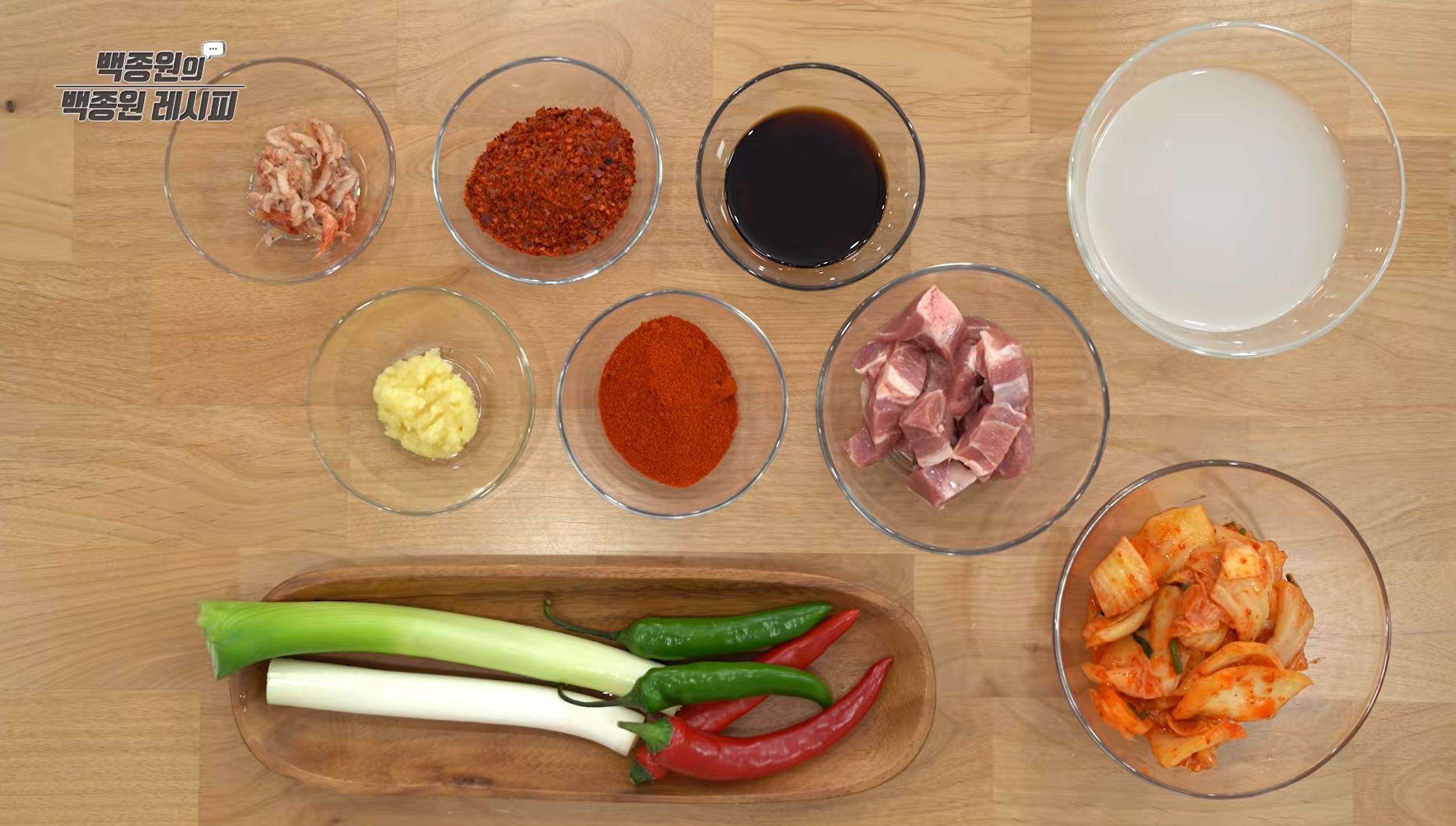 돼지고기 120g, 쌀뜨물 380ml (약 2컵), 자른 김치 150g, 다진마늘 30g (2큰술), 대파 30g, 청양고추 10g, 홍고추 10g, 고운 고춧가루 30g (2큰술), 굵은 고춧가루 30g (2큰술), 국간장 15ml (1큰술), 새우젓 15g (1큰술)