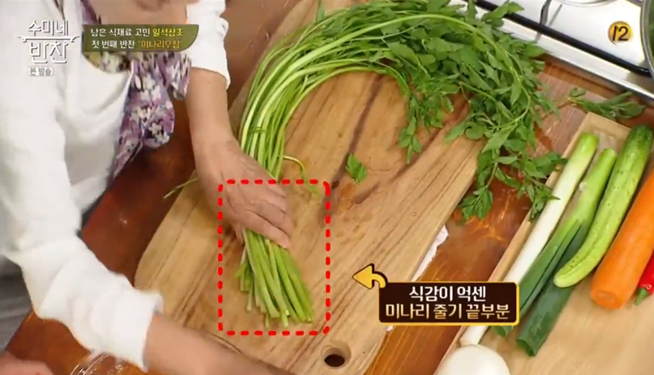 3. 미나리 이파리와 식감이 억센 줄기 끝부분은 잘라서 '미나리전'에 활용해도 좋다고 하네요.