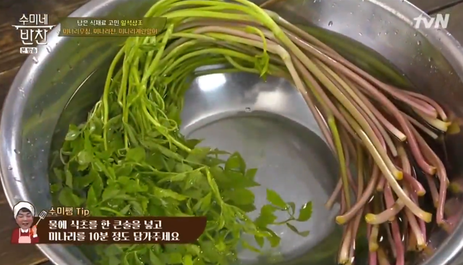 1. 먼저 미나리를 깨끗이 씻어야 하는데요, 미나리 씻는 방법은 물에 식초를 한 큰술 넣고 미나리를 10분정도 담가두면 됩니다.