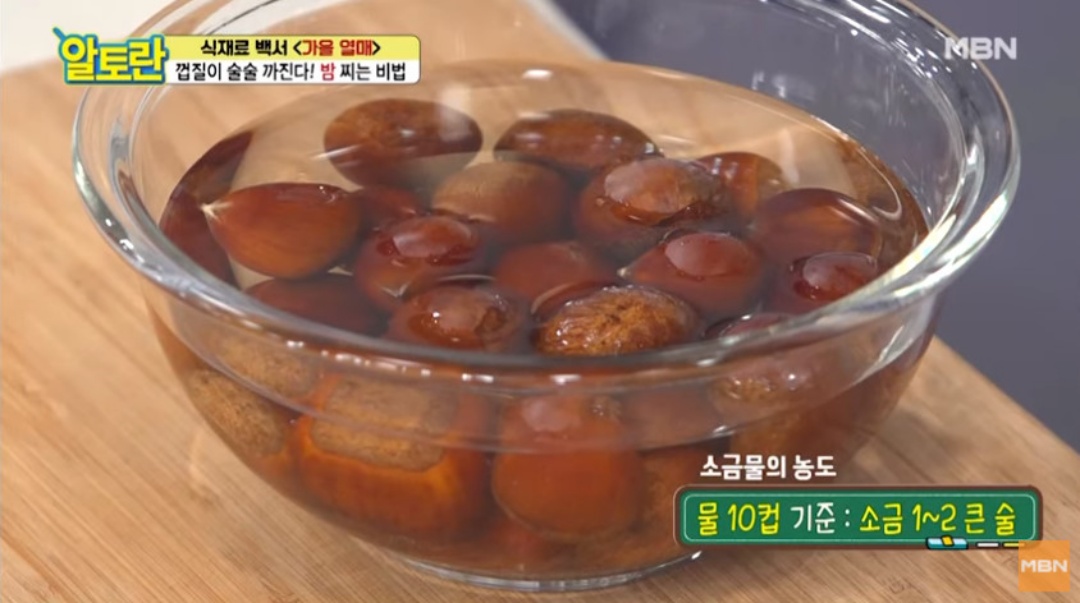 밤을 보관하기 전에 해야 할 중요한 일은 밤 손질입니다. 밤 손질을 제대로 하지 않으면 어떻게 보관하던 문제가 생기기 때문인데요, 먼저 밤은 3~5%정도 농도의 옅은 소금물에 1시간 정도 담가주세요. 소금물 농도는 물2L에 소금 3~4큰술 정도라고 보시면 된답니다.