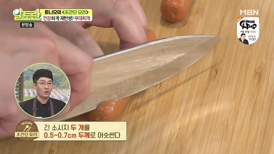 3. 긴 소시지 두 개는 0.5~0.7mm 정도 두께로 어슷 썰어 주시구요.