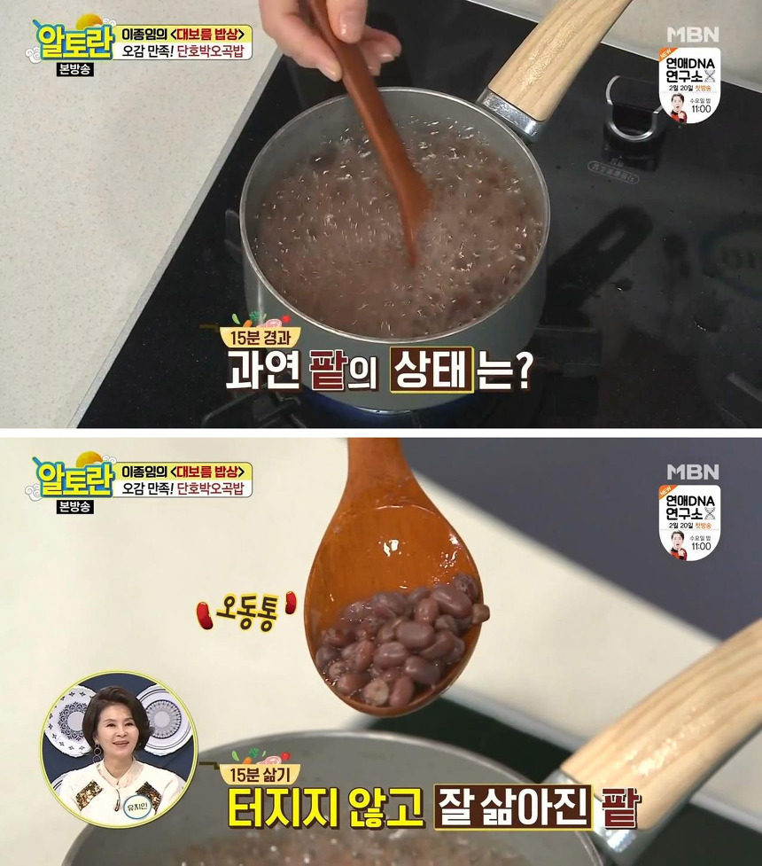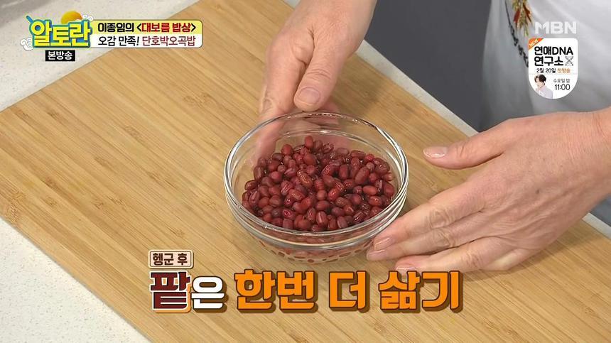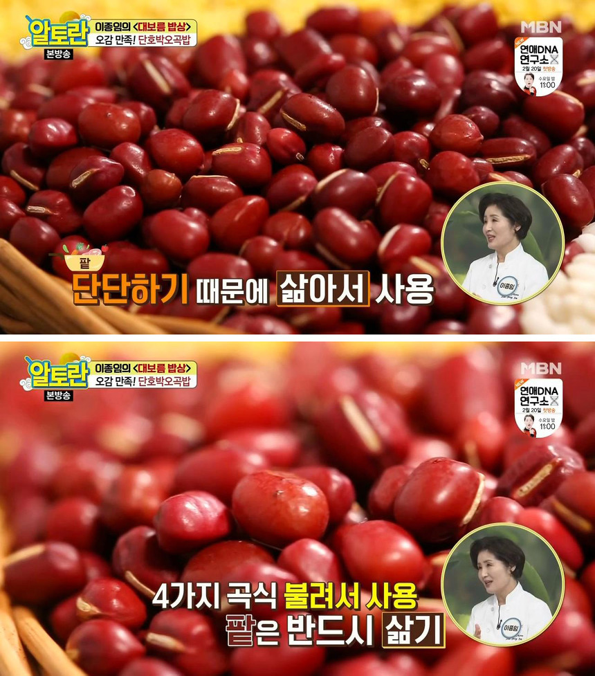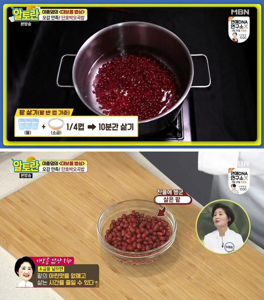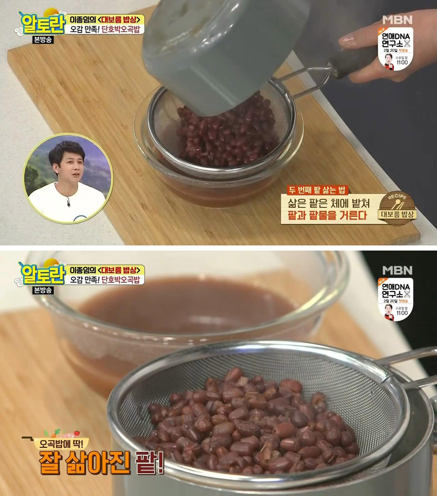 여기서 오곡밥 만드는 방법 이종임 황금레시피의 비법 한가지! 헹군 후 팥을 한번 더 삶아주는 것이예요. 다소 귀찮게 여겨질수도 있지만 이렇게 팥을 두 번 삶으면 팥의 떫고 아린 맛도 제거하고 팥을 부드럽게 익혀주기 때문이랍니다.