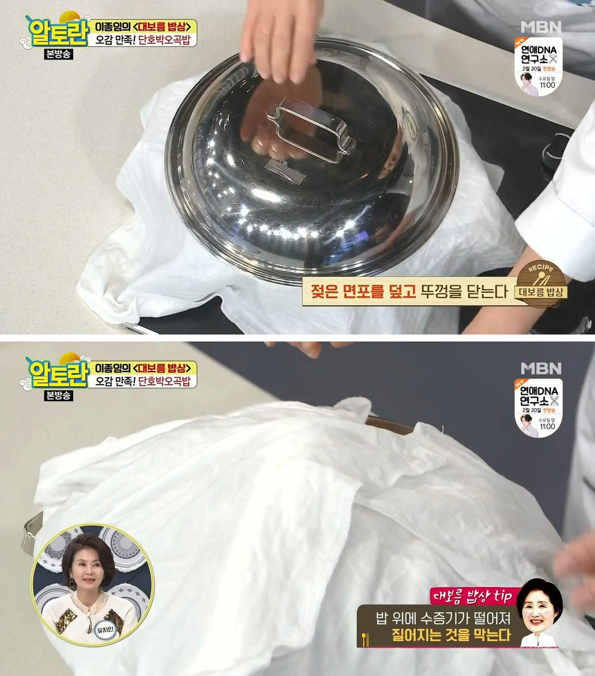이렇게 젖은 면포를 덮는 이유는 밥 위에 수증기가 떨어져 질어지는 것을 막아주기 때문이라네요.